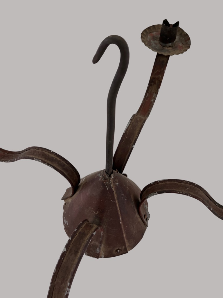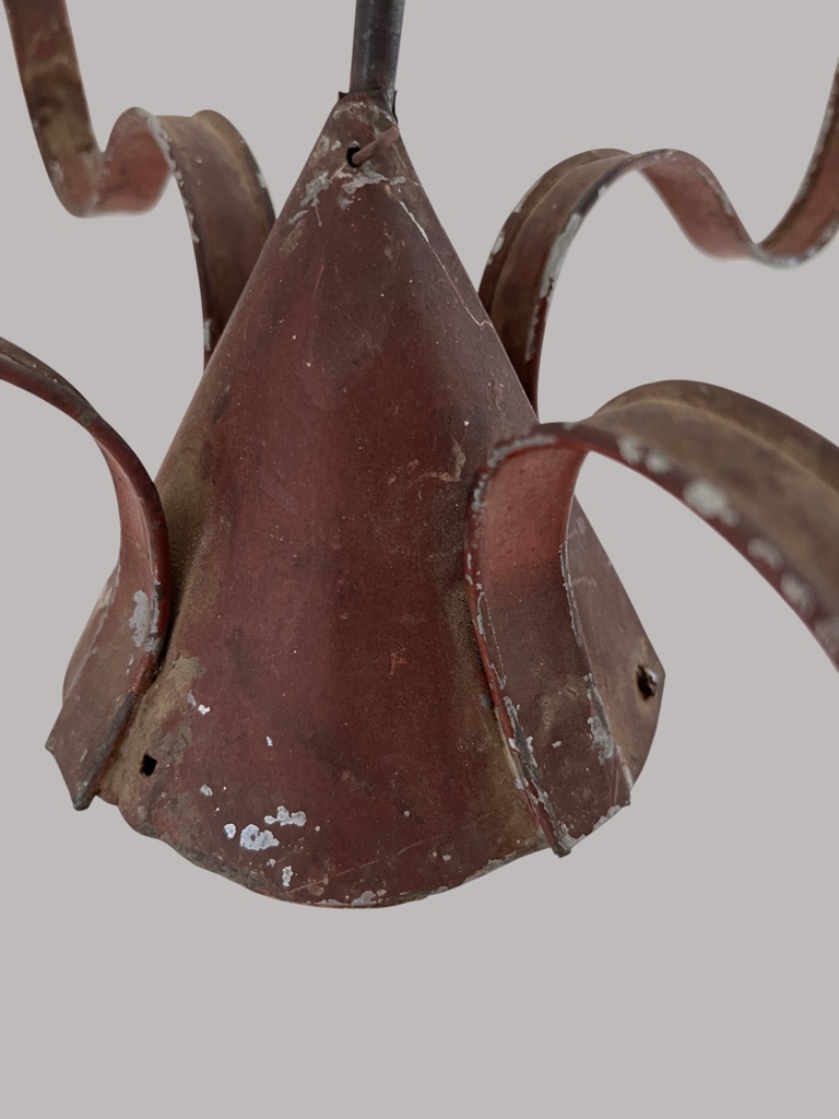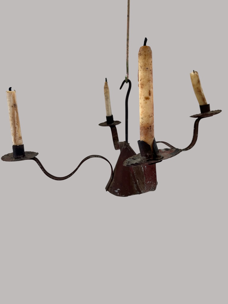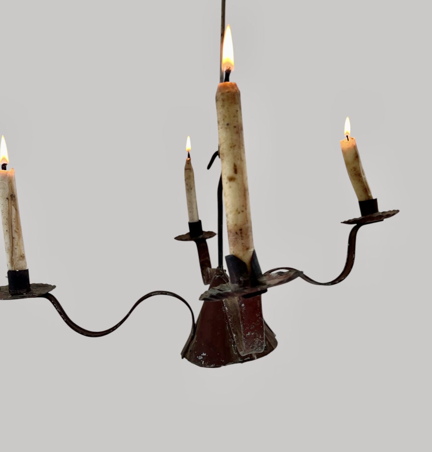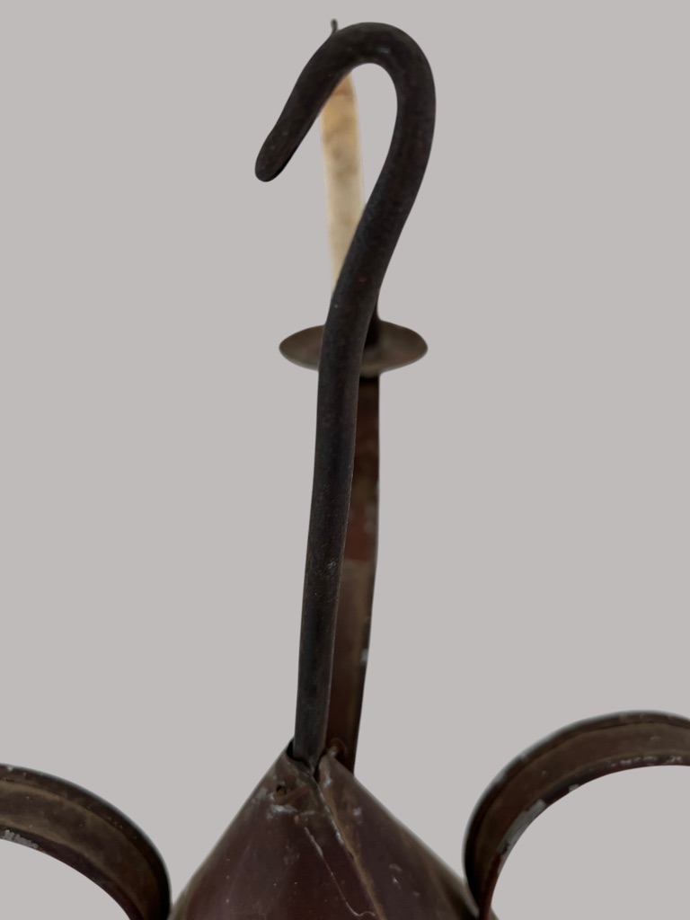 A wonderful mid 19th. century tin chandelier with a witches hat center from which 4 arms extend that hold candles. Great early form. The paint is original Red. The chandelier measures abut 11 inches to the top of the hook and about 22 inches from candle cup across to candle cup.The bottom of the witches hat is wooden. The arms are a bit wonky but are flexible and can be adjusted. Circa 1830-1840, such a nice early design with the witches hat center. Early and authentic period chandelier. Price: $2375.00 + shipping