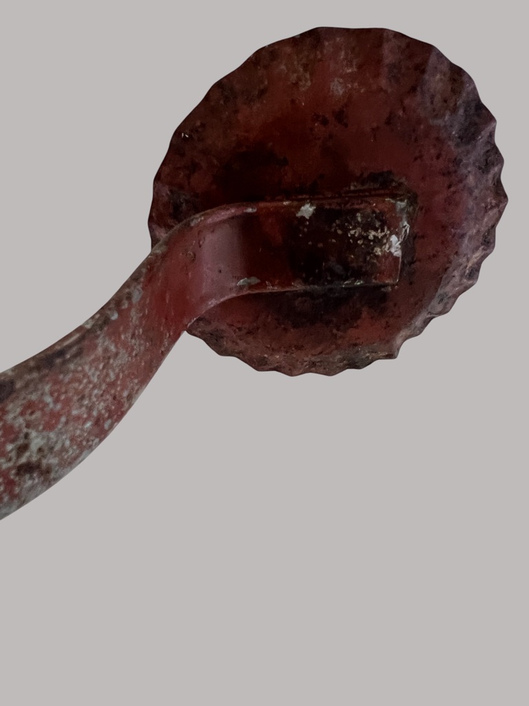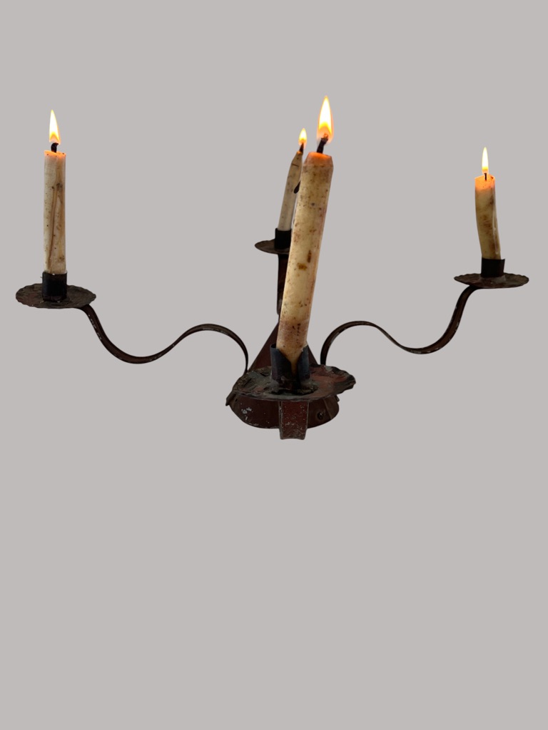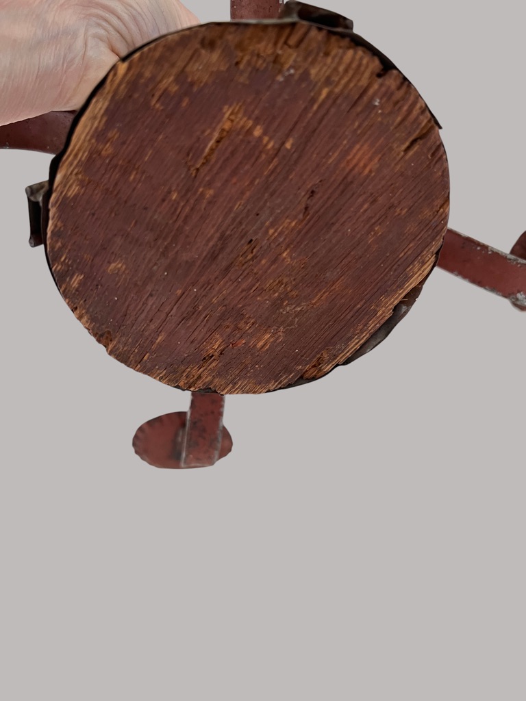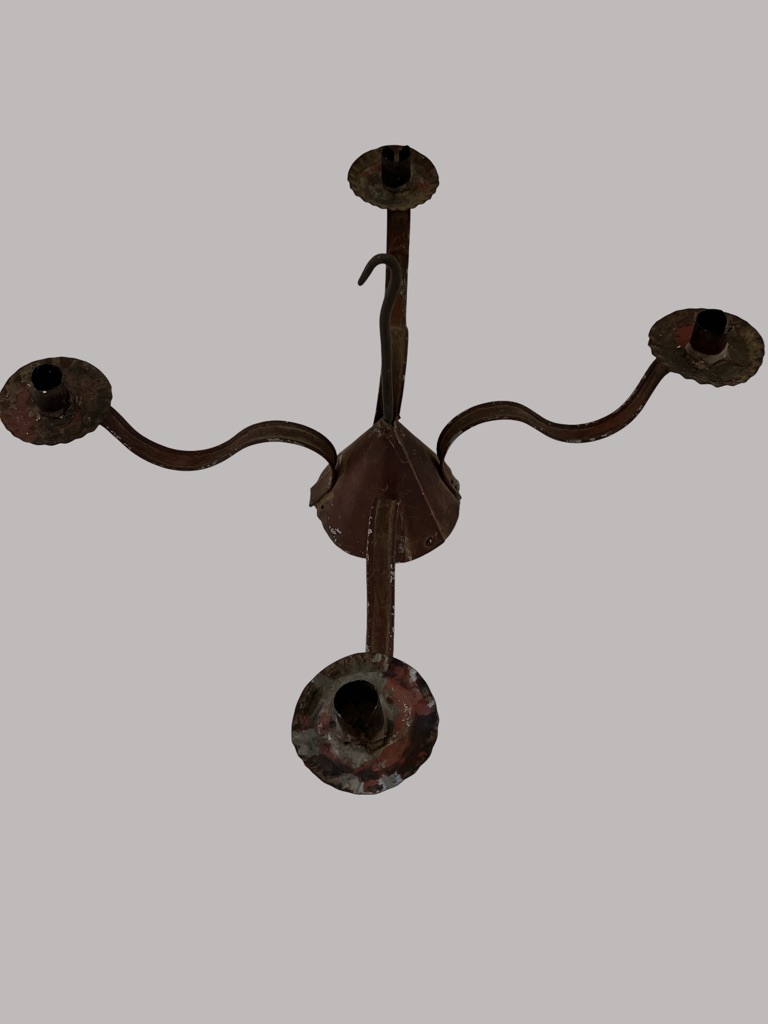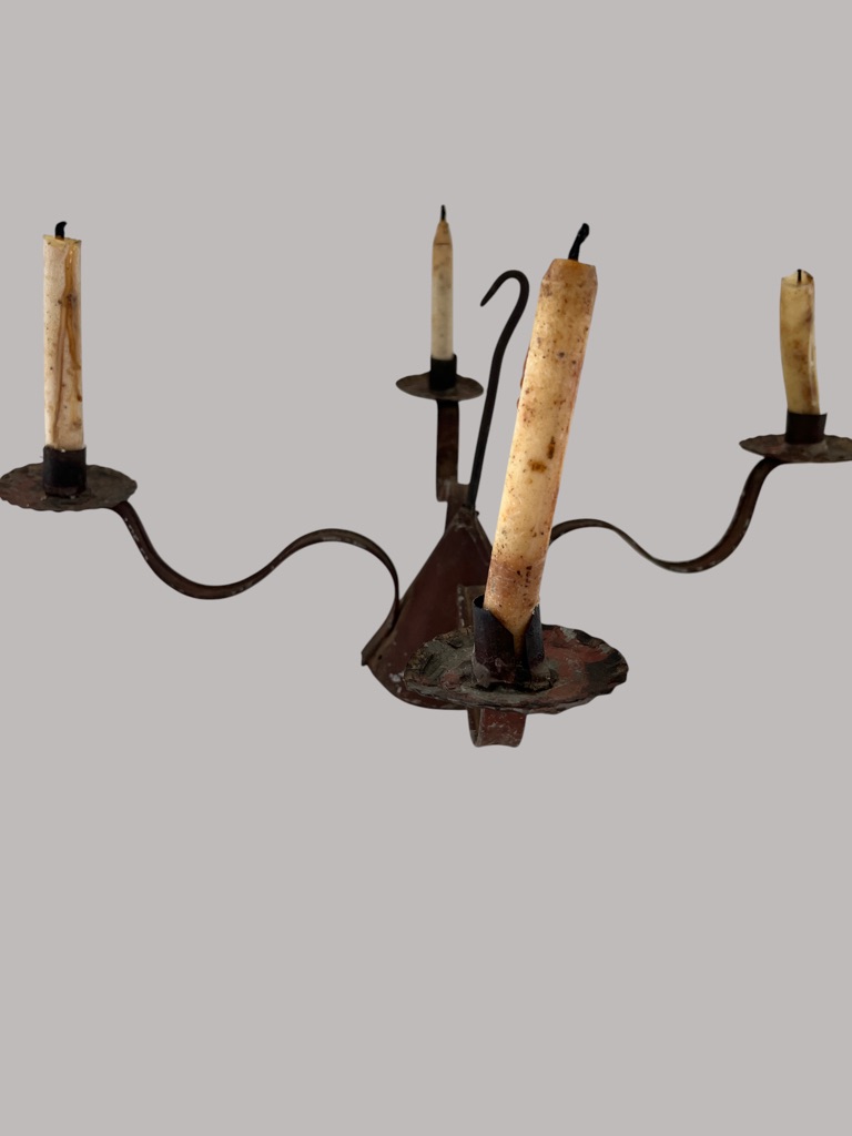 A wonderful mid 19th. century tin chandelier with a witches hat center from which 4 arms extend that hold candles. Great early form. The paint is original Red. The chandelier measures abut 11 inches to the top of the hook and about 22 inches from candle cup across to candle cup.The bottom of the witches hat is wooden. The arms are a bit wonky but are flexible and can be adjusted. Circa 1830-1840, such a nice early design with the witches hat center. Early and authentic period chandelier. Price: $2375.00 + shipping
